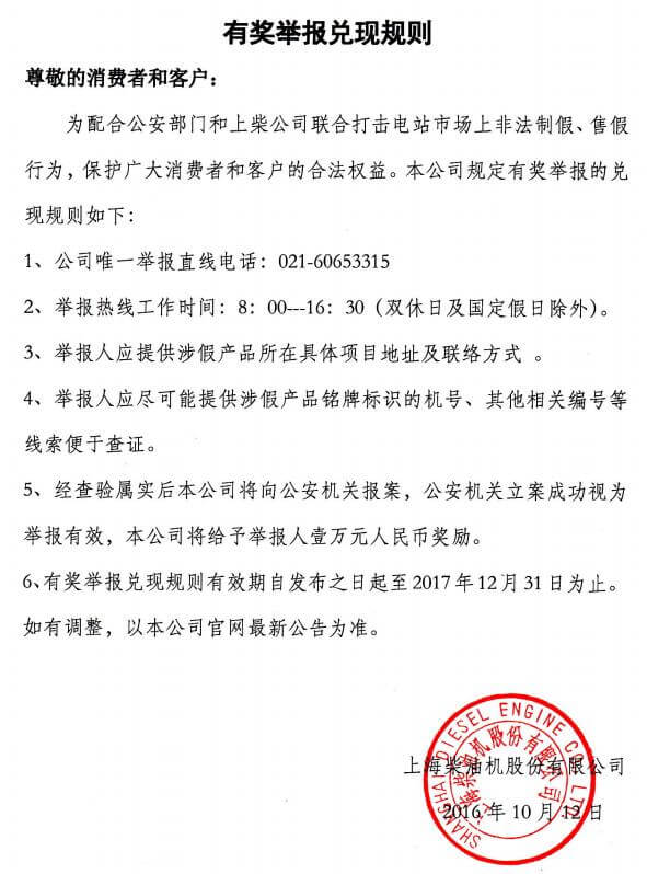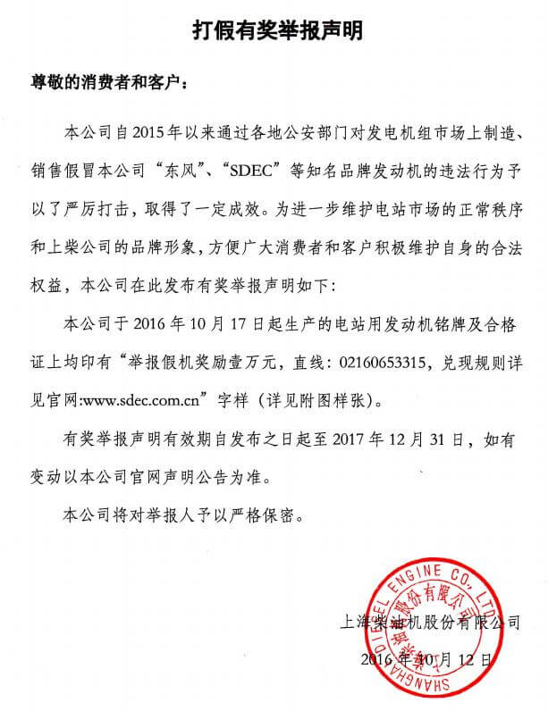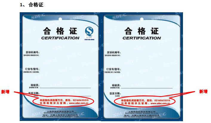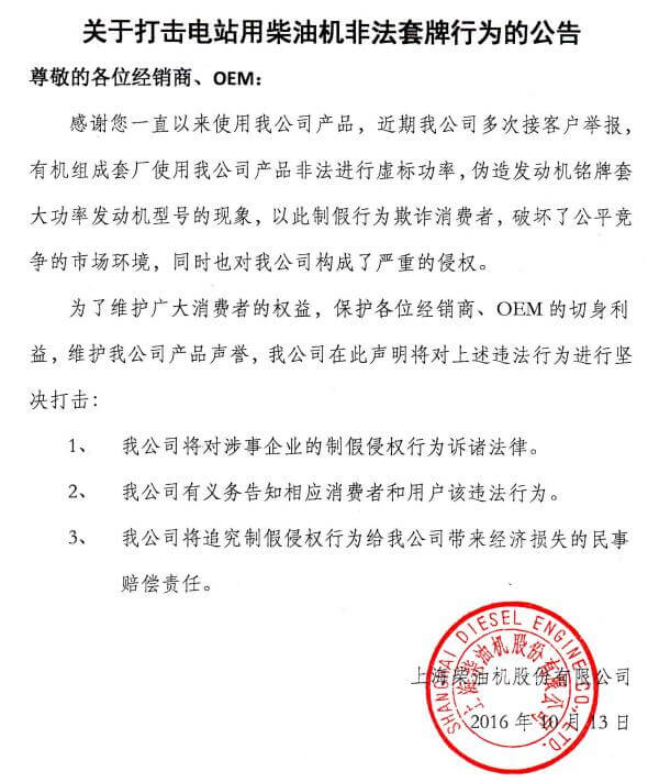 从2015年起,上海柴油机股份有限公司开始对发电市场进行维权行动。上柴的机器从机体钢印、工业二维码一直到零配件包括启动马达、发电机、增压器以及滤清系统都已经“武装”。从2016年10月17日开始执行新铭牌以及合格证。